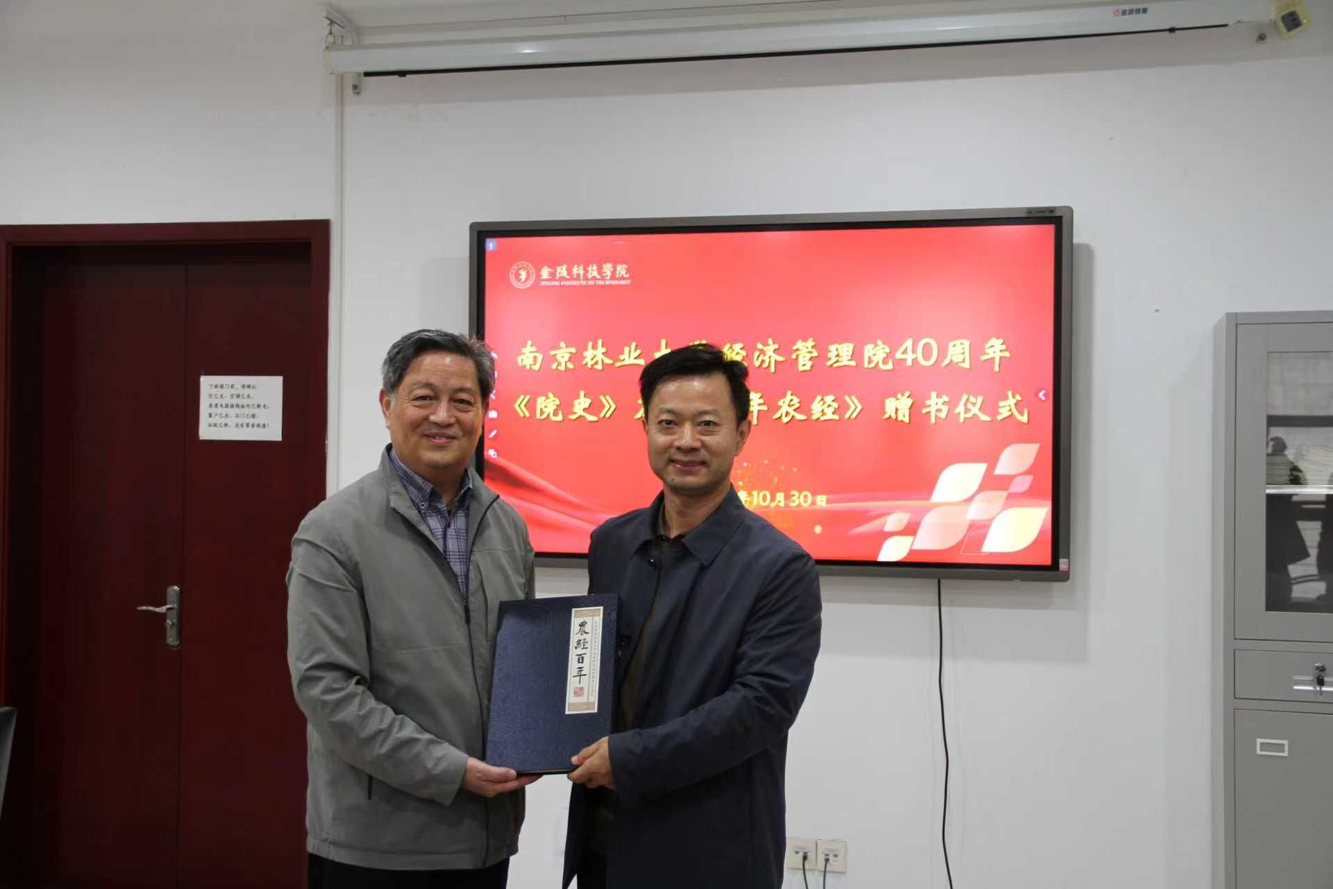 指导会前,聂影将南京林业大学经济管理院40周年《院史》及《百年农经》等图书赠予学院。