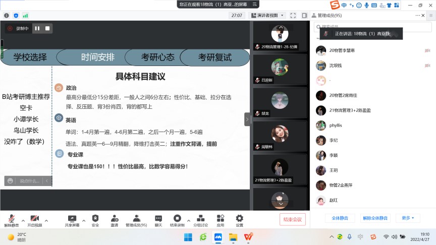 2022年4月27日晚上7:00至8:00,物流系举办了第三届就业经验分享会。物流系姚雨辰副主任主持了会议,物流系主任姜方桃、物流系老师程娟和物流系学生总共95人参加了此次会议。会议采用用腾讯视频的形式(腾讯会议号:682737978),主要由几位大四毕业班同学针对自己考研计划安排、个人简历制作、面试准备等就业相关的经验进行交流分享。