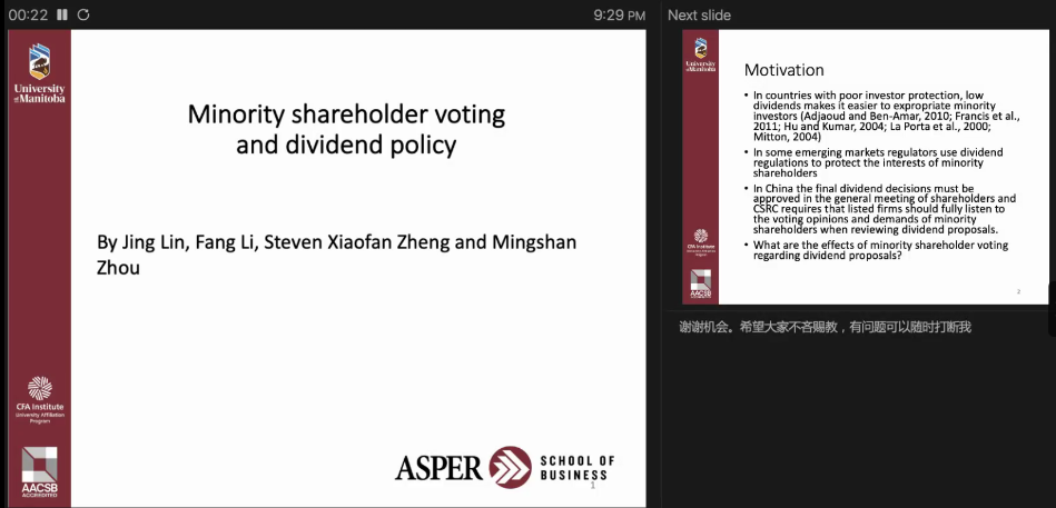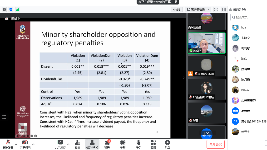 10月11日上午,科技处、教师发展中心主办,yl9193永利集团承办了金科学术讲堂系列讲座,邀请加拿大曼尼托巴大学Asperyl9193永利集团教授郑小凡作《小股东投票与现金分红》主题讲座,yl9193永利集团部分教师和学生以及其他学院感兴趣的教师共计200余人参加了讲座。讲座由yl9193永利集团副院长史新和主持。