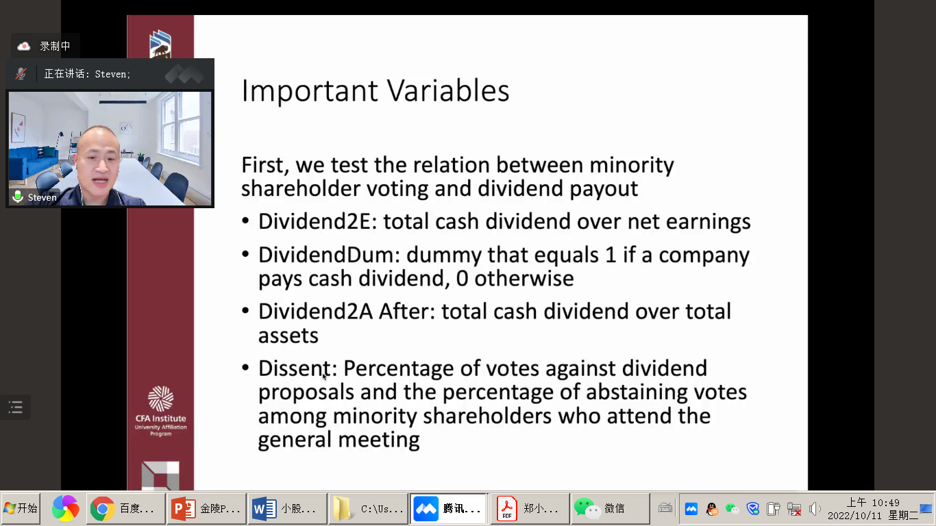 郑小凡从“小股东投票对股息提案有什么影响”这个有趣的问题出发,采用两阶段最小二乘法和倾向评分匹配方法,经过严密的经济学分析,发现了小股东投票对股息提案的影响,验证了股利支付增加与少数股东投票反对股利方案的比例呈正相关,监管处罚的概率和频率与少数股东投票反对分红提案的比例呈正相关,公司增加派息后,监管处罚的概率和频率降低等先验观点。研究成果对公司治理和股利政策以及投资者保护方面提供了启示。