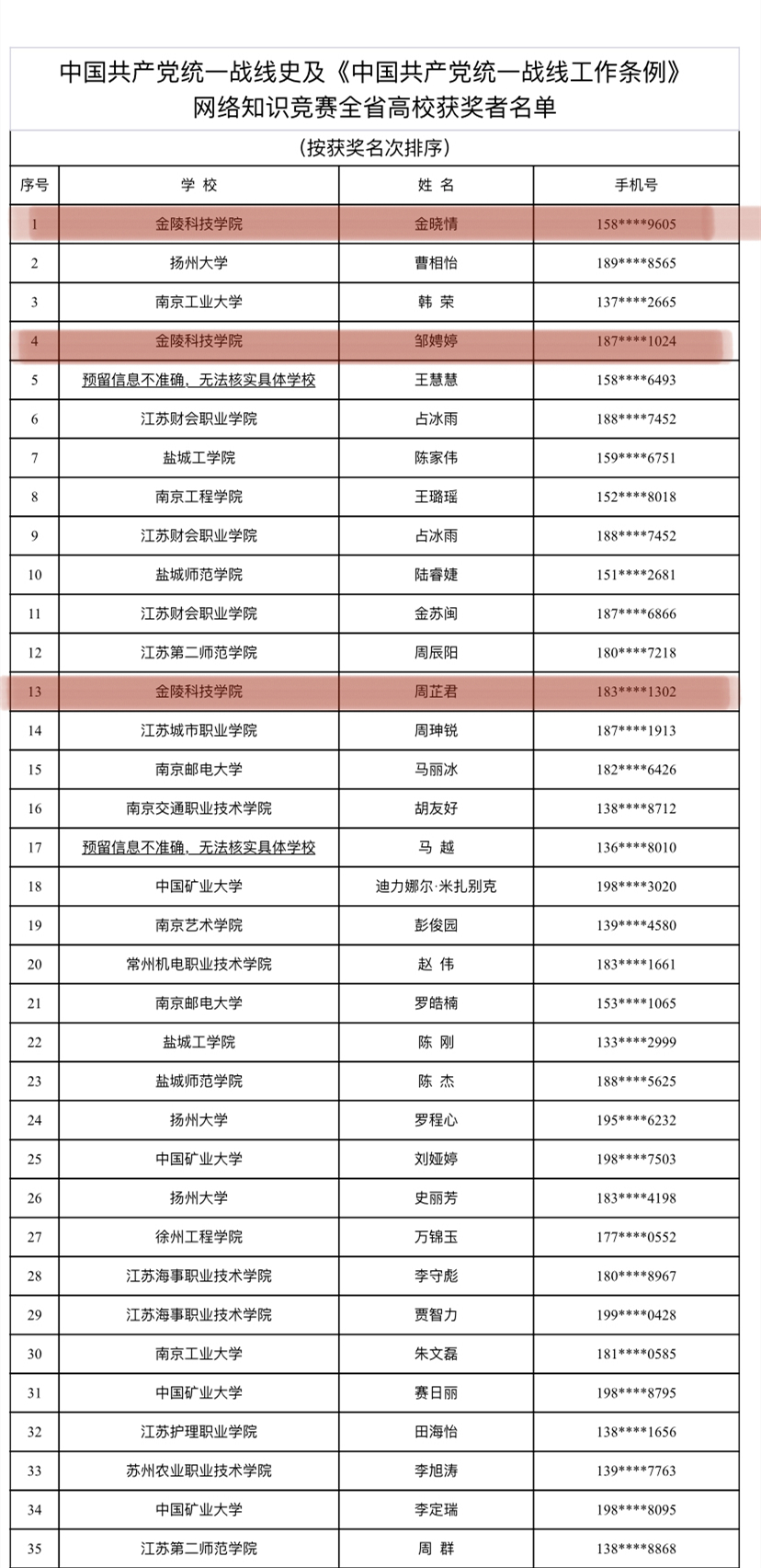 由江苏省委统战部组织开展的中国共产党统一战线史及《中国共产党统一战线工作条例》网络知识竞赛于7月31日18时落下帷幕。三个月来,全省近28万人参与此次竞赛,前500名获奖参赛者中,我校共有3名同学榜上有名,均来自yl9193永利集团,其中第1名更是被我院市营、物流学生党支部党员17市场营销(2)班金晓情同学摘获,18会计学(3)班邹娉婷、17物流管理(1)班周芷君分别获得第4名和第13名的优异成绩。