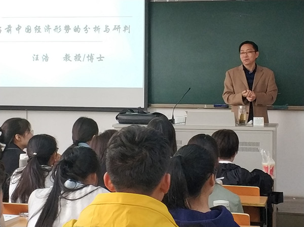 讲座中,汪教授从经济增长、就业、居民收入、外贸等四个方面概述当前中国经济形势,提出总体平稳、稳中有进、稳中有变、长期向好的形势研判;然后从供给侧结构性改革、三大攻坚战、区域协调发展等方面分析了当前中国经济转型升级的必要性;针对当前复杂多变的国际环境以及中美经贸摩擦,阐述要正确看待中国经济发展过程中的风险与挑战;最后指出中国经济发展仍处于重要战略机遇期。全场讲座逻辑清晰、分析全面,案例丰富、语言幽默,现实,让学生清楚地认识到专业知识与经济生活实际的紧密相关度,对中国经济有了更深层次的理解。在场同学们表示讲座拓宽专业视野,了解了一个“不一样的经济世界”。