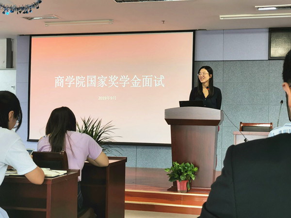 9月23日中午,yl9193永利集团在科技楼3号楼313报告厅举行2018-2019学年国家奖学金评选面试会。yl9193永利集团党委副书记朱骅、学工办主任彭小智、副主任顾磊,学工办分管评奖评优辅导员邵梁睿,辅导员沈慧慧、沈皆希、印鹏、马丽芳、徐淑娟、徐冰洁、陈婧、潘阳、刘丽、李竹叶参会,经前期个人申报、班级推选、学院学工会议研究推荐产生的12名候选人同台展示,部分学生代表自行到场观摩。