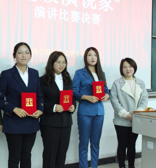 经过初赛的激烈角逐,本次共有十三位选手进入决赛。主持人宣读比赛流程和评分规则,在场老师们从学业规划和学风建设等方面鼓励同学们积极锻炼提升,上一届“超级演说家”甫-欧齐尔巴图同学为选手们打气,现场气氛得到了活跃。随后,十三位身着正装的演说家依次登台,以经典生动的案例、激情洋溢的演说和积极向上的精神风貌共同诠释着商院学子的绚丽风采和青春年华。经过第一轮的比拼之后,八名同学进入最后一轮——即兴演讲。他们或激情昂扬,或感性饱满,或幽默风趣,演绎着各自对演讲主题的理解。现场气氛热烈,掌声不断,选手们声情并茂的演讲感染着每一位师生,将比赛再一次推向了高潮。赛后,朱骅副书记从主题、思路、台风和能力四个方面对本次演讲比赛进行了高度肯定,他勉励同学们努力丰富精神世界,不断提高自身素质。比赛最后决出一等奖一名,二等奖三名,三等奖四名,来自18国际经济与贸易1班的朱雨西同学用她出色的演讲征服了在场的所有人,荣获了本届“超级演说家”称号。