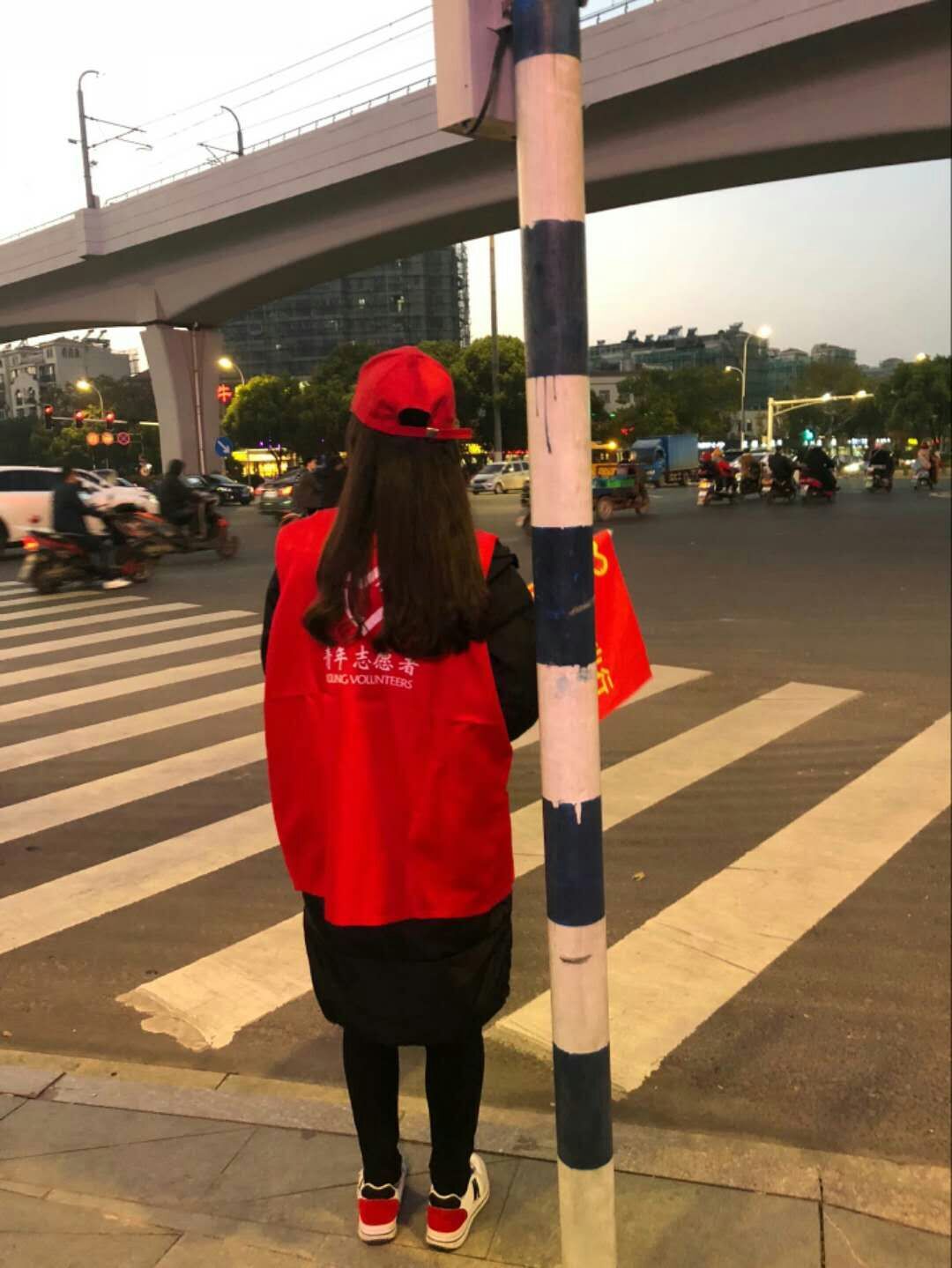 11月19日早上活动开始,志愿者四人一组分守在三个方向路口,同时联络人送马甲、帽子、交通引导旗到各个路口。部分志愿者手执交通文明小旗,引导行人“红灯停,绿灯行”,部分志愿者则站在路口,对非机动车和行人的越线停靠、不文明穿行马路等行为进行监督、劝阻。志愿者们身穿红色马甲、头戴红色小帽,以昂扬的精神面貌和高度的社会责任感展现了他们良好的形象,在川流不息的人群中,志愿者们俨然成为路边一道别样的风景,他们的志愿服务行为也得到了群众的认可和支持。
