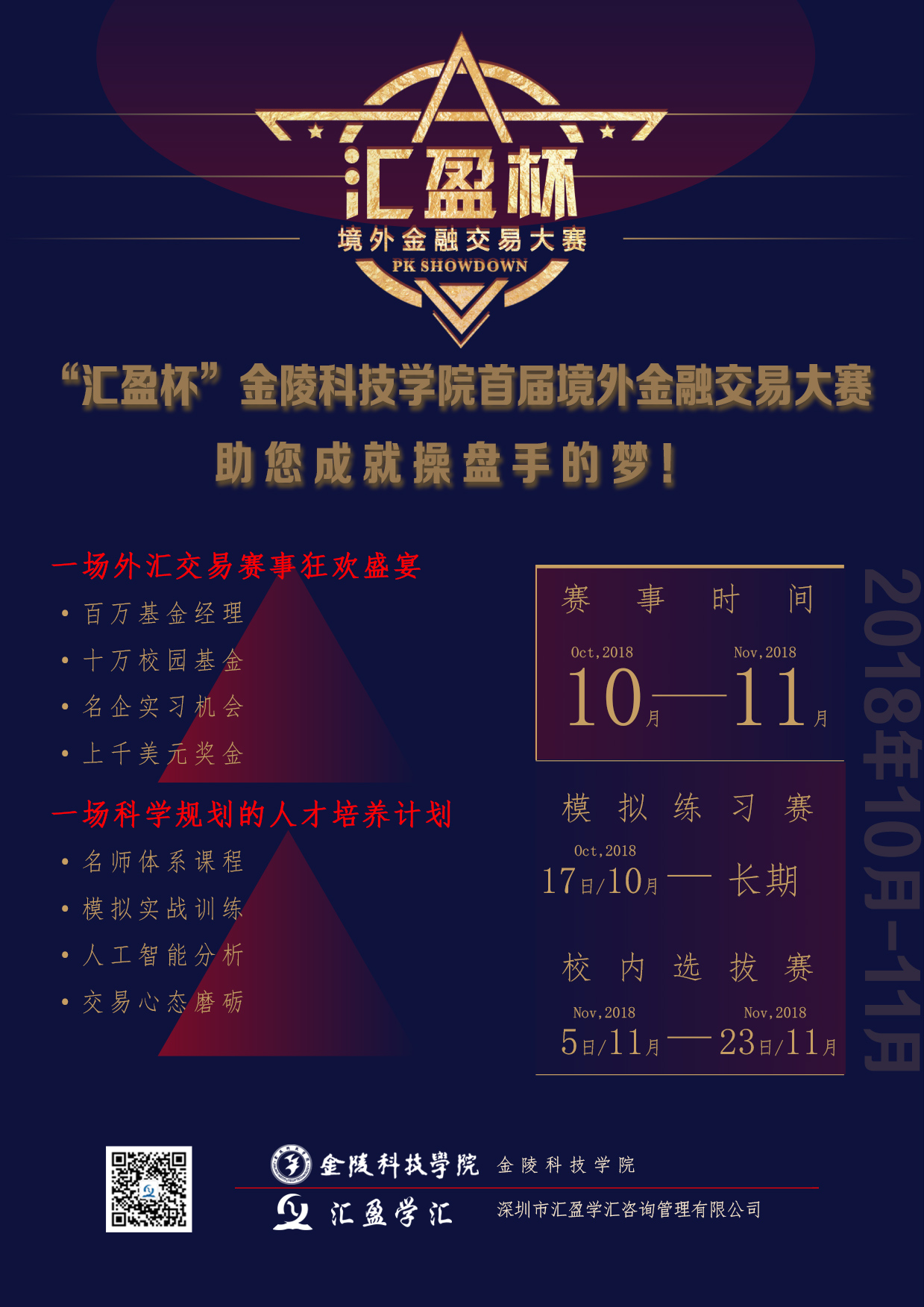 本赛事以培养孵化“高财商”金融人才、为广大学子实现金融梦想为愿景,以“金融模拟实训”为主线,通过搭建外汇模拟实训交易的竞技平台,结合国际金融实务知识和投资策略教育培训,采取“全生命周期”的培养模式,系统记录学生在校期间参与模拟训练和实务培训的表现,把金融知识带出课本,把金融实践带入学校,拓宽高校学生全球金融视野,在校内选拔出优秀的金融交易人才,由指导老师组成学科小组持续培养,并代表学校参加“汇盈杯”全国高校百万美元基金经理终极选拔赛。